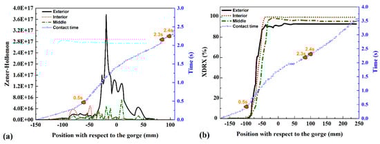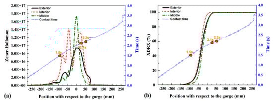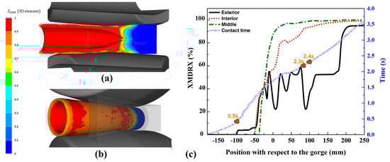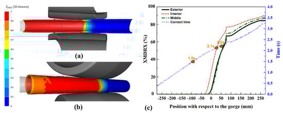 Both the inner and middle areas had a higher MDRX rate and reached full meta-dynamically recrystallized volume fractions at the exit of the mill; however, the outer area showed lower values and required more time to achieve a full MDRX volume fraction. The MDRX change of the shell is shown in Figure 14a,b. The inner and middle areas were subjected to MDRX upon DRX completion. Therefore, as can be seen in Figure 14, MDRX occurred within the area between the plug tip and the rolls gorge, where the material was rotating without being deformed by the rolls. However, the external area of the shell showed a lower MDRX rate before the material exited the rolling mill (200 mm after the rolls gorge). At that point, the MDRX rate increased until reaching the position of the water jets to cool the external area of the pipe after piercing (250 mm after the rolls gorge).