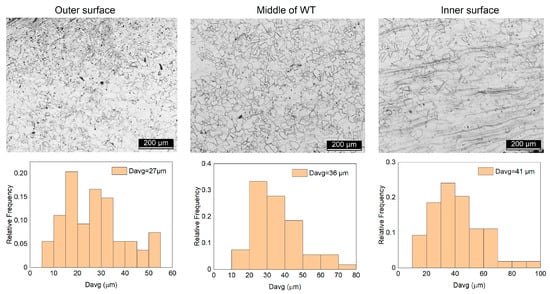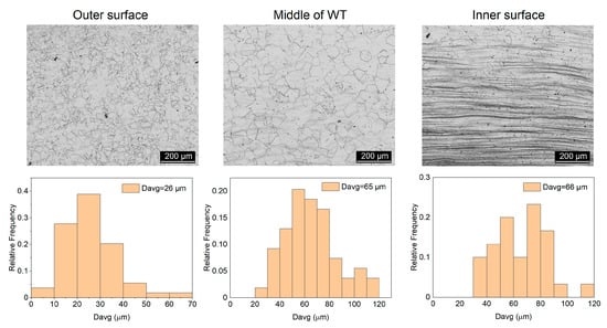 Firstly, dynamic recrystallization occurred in the material during deformation at the stage of the piercing operation. The strain rate had a higher value within the outer area of the shell, and the temperature was slightly higher than in the middle and inner areas. Thus, theoretically, the strain required for developing a similar DRX fraction in the material decreased with the increase in temperature and decrease in the strain rate. At the stage of the piercing operation, the strain was first concentrated within the outer area of the shell, and as soon as the shell transverse area was reduced, the deformation extended to the middle and inner areas. As can be seen in Figure 10b, the DRX fraction was first increased within the outer shell area, but as long as the material was subjected to piercing, the lower strain rate in the middle and inner areas (see Figure 9b) contributed to a higher DRX fraction within the aforementioned areas. Figure 11 shows the microstructure and histograms of the grain size distribution for the outer surface (exterior) and middle and inner surfaces (interior) of the pierced tube.