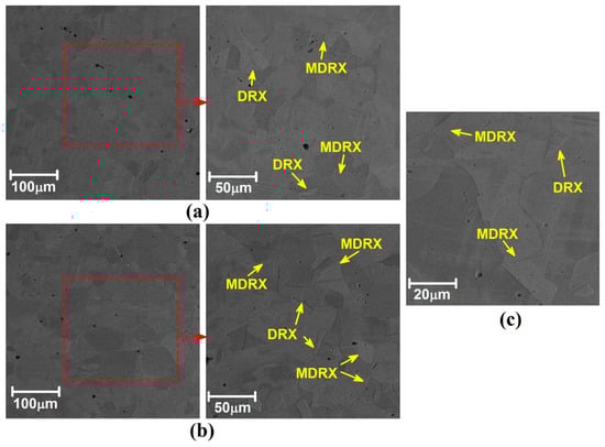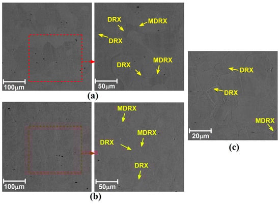 The results show grains with different sizes in both cases. It confirms that the growth rate of the DRX grain is not very high in this steel during the piercing process. The microstructure of different areas is inhomogeneous due to various mechanical stresses (compression, tension, and shear) during the piercing phase of the raw material. Lamellar colonies and the high percentage of dynamic recrystallization cannot be detected in a high magnification of the microstructure. The DRX grains and small percentage of MDRX can be detected in the high magnification of the microstructure depicted in Figure 13a,b. By comparing the interior and exterior areas of the pierced tube, it can be concluded that MDRX in the exterior area is lower than in the interior area. Due to the higher cooling rate of the exterior area with air and rolls, the exterior area of the tube experienced a higher heat loss. Therefore, DRX growth decreases, and DRX nucleation for MDRX is limited. A closer analysis of the exterior area (Figure 13c) revealed that DRX nuclei did not grow during piercing, which is the main reason for the difference in MDRX between the interior and exterior areas.