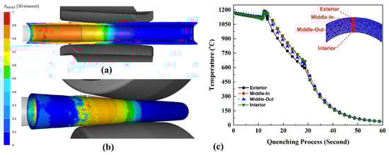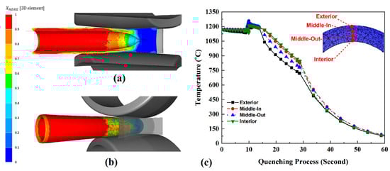 MDRX volume fraction during the elongation stage at (a) internal section and (b) outer view. (c) Temperature change within the shell thickness section during quenching.
