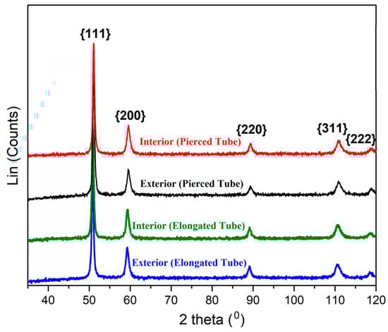 Based on the values listed in Table 2, it could be concluded that the action of the water-cooling jets on the external surface at the beginning of the quenching process resulted in a higher cooling rate (31.5 °C/s) as compared to other areas, while the inner area showed the lowest value of 22.8 °C/s. Fifteen seconds later, there was a temperature difference of 130 °C between the external and internal surfaces of the shell. Then, the shell was submerged into water, and the cooling rates showed the opposite distribution behavior: with the inner area showing the highest cooling rate throughout the entire quenching process with the value of 50.4 °C/s. Twenty-five seconds later, both the external and inner areas of the shell showed the same cooling rate. Regarding the middle points, both the external and inner middle points showed the same cooling rate during the entire quenching process. The cooling treatment applied to the pierced tube after the piercing phase had no significant effect on the chemical structure of 904L steel. This cooling procedure was used mainly due to the release of internal stress. The most considerable effect of the selected cooling rate was on the grain growth of the pierced tube. The EDS map from the internal and external parts of the pierced tube after the cooling stage shows the uniform chemical distribution. The selected chemical elements percentage tables and EDS map are presented in Tables S1 and S2 and Figures S1 and S2 in the Supplementary Electronic Document at the end of the manuscript.