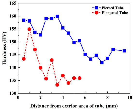 - The average hardness measurements for the internal and external surfaces of the pierced shell were 155 ± 3 HV and 140 ± 3 HV, respectively. Similarly, the average hardness values for the internal and external surfaces of the elongated pipe were determined to be 149 ± 3 HV and 140 ± 4 HV, respectively. Monitoring changes in hardness can prove valuable to various industries, especially in subsequent processes like cold deformation or welding. The proposed method, which includes accelerated spray cooling as the pipes exit the deformation zone, holds promise for producing pipes with consistent structural and property characteristics. This innovative approach eliminates the need for additional heat treatments, enhancing production efficiency. It is also crucial to ensure the uniform accelerated cooling of both the external and internal surfaces of the pipes, which can be achieved by directing water through specialized openings in the plug rod.