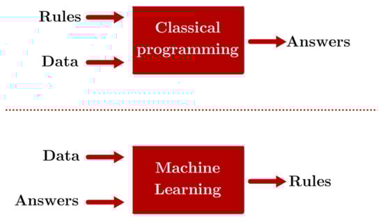 Recent advancements in processing power and algorithms have made it easier than ever to deploy machine learning (ML) solutions, and the intricacies of the processing-properties relationships of AM techniques represent an interesting case for the development of ML algorithms. These excel in cases where the inputs and outcomes of a particular phenomenon or task are known, but connecting the two through an explicit set of rules or relationships can be extremely complex and time-consuming [10]. In this manner, ML models are trained as opposed to explicitly programmed, as illustrated in Figure 1, where the differences between ML and traditional programming philosophies are compared. ML techniques are applicable in situations where the inputs and outputs of a particular phenomenon are known, but there’s a lack of explicit rules that indicate a relationship between the two.