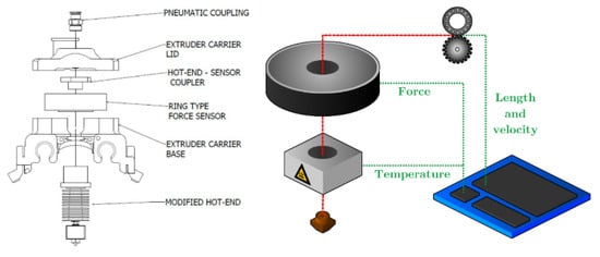 A set of 4 identically customized ME 3D printers (Minilab by FusedForm, Bogotá, Colombia) fitted with sensors capable of recording the force exerted by the filament upon the nozzle, discrete measurements of temperature, and changes in the extruded length over time were used to reproduce a variety of tensile coupons. A schematic of the printer setup can be seen in Figure 2. The data was collected using an Arduino board sampling at a frequency of 5 Hz, connected to MATLAB for visualization, processing, and logging. A Butterworth filter was applied to amplify the signal-to-noise ratio of the outputs of the system. The force sensor and encoder have an innate uncertainty of ±10 g and 600 pulses per revolution respectively. And the extruder motor has 200 pulses per revolution. A random set of printing conditions was reproduced on all printers to monitor printer-to-printer variability. More information pertaining to the construction of the printer and processing of the data can be found in the work of Mazzei Capote et al. [5]. Except for inline force measurement, the application of a pressure sensor at the heating block can also characterize rheological performance.