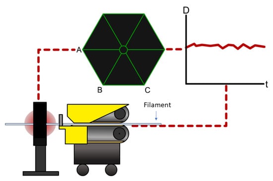 Additionally, as an exploratory experiment, the geometric information of the filament was collected and paired with the rest of the information stemming from the in-line measurements of a handful of prints to assess if variations in the filament geometry resulted in notable changes in the required extrusion force. This data was attained through the use of a laser micrometer and a conveyor belt, pulling the material at a constant, known speed. The process yielded discrete measurements of the filament diameter and ovality as a function of filament length and time. A schematic of the process can be seen in Figure 4, where a symbolic diameter D changes over time t is shown. The locations of lasers are labeled as A, B, and C.