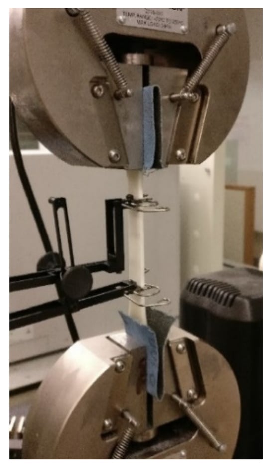 Tensile testing was performed using an Instron 5967 dual-column universal testing machine fitted with a 30 kN load cell. All data acquisition was handled through the accompanying Instron Bluehill 3 software. A movement speed of 5 mm/min was used to deform the 50 mm gage section of the specimens, with all deformations being logged using an extensometer. To protect the samples from the excessive gripping force, emery cloth tabs were used [21]. This setup can be seen in Figure 5. The final step of the process involved matching the printing data to its corresponding mechanical test results and assembling everything in a single database. This was conducted using Python code that would search the directory of the raw data and construct a .csv file including all the pertaining information of an experimental run in a row. This step is necessary for the ML code to quickly read and understand the information that it is attempting to model.