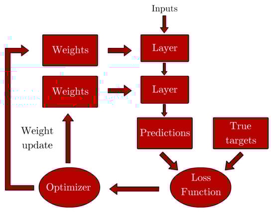 The weights of each neuron are iteratively tuned in a process that involves penalizing the model using a loss function that compares the predictions of the model with true output values using example data. This process is effectively an optimization task where the goal is to minimize the loss function. A schematic of the process can be seen in Figure 6, using a two-layer network architecture as an example.
