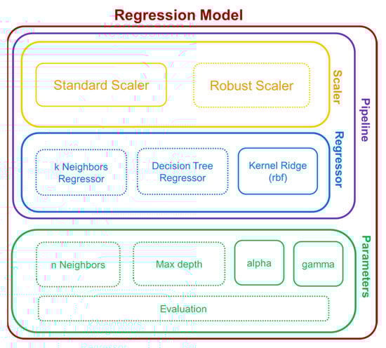 The pipeline is composed of scaling and regression, as shown in Figure 7. Scaling refers to a linear transformation with the purpose of avoiding feature prioritization. The most common scaler is called the “Standard Scaler”, which transforms features by subtracting the mean value and dividing by the standard deviation. Another common scaler, called the “Robust Scaler”, subtracts the median value over the interquartile range. Both scalers are selected as candidates in the pipeline under the scaler section.