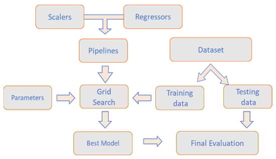 GridSearchCV (GSCV) is a modulus under sklearn for hyperparameter optimization with cross-validation (CV). CV is an evaluation method that involves training the algorithms multiple times with different partial training data and evaluating them with a complementary subset of training data [30]. The main sections include the estimator and the corresponding parameter grid. The combination of cross-validation and grid search is an efficient way of determining the best hyperparameters within the parameter grid. And the pipelines can be used as estimators. The workflow is shown in Figure 8. The scaler and regressor candidates are listed in the pipeline, which is fed into the grid search system for determining the best combination of the provided parameter options with training data. The best model will be applied to testing data for a final evaluation.