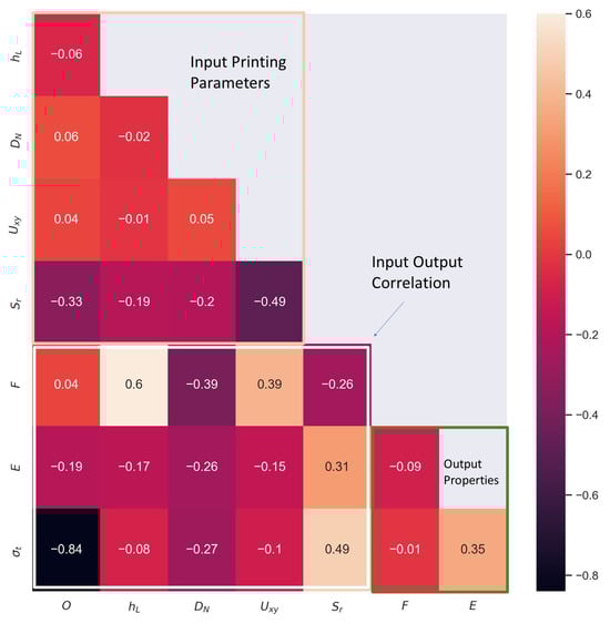 Pearson Correlation Matrix (O: Orientation; hL: Layer Height; DN: Nozzle Diameter; Uxy: Print Speed; Sr: real-expect speed ratio; F: Extrusion Force; E: Young’s Modulus; σt: Tensile Strength).