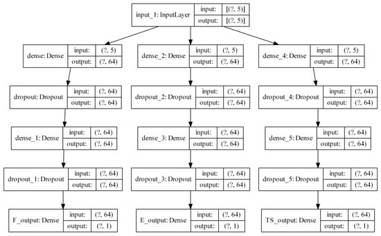The network architecture involved a single input layer and three branches. Each branch computes the output of the expected F, E, and σt. Each branch contains two dense layers, with a “dropout” layer in between. This process randomly removes a number of neurons from the preceding layer temporarily with each iteration of the training process, ranging from 0% to 100% of the neurons. This has the effect of ensuring the network adapts by establishing connections that are truly meaningful between nodes, which tends to prevent overfitting. The chosen rate of dropout for all dropout layers was 0.5, meaning that each epoch, 50% of the neurons was temporarily removed from the model. A schematic representation of the model generated through TensorFlow can be seen in Figure 11. The inputs of the network were the 4 controlled variables and the ratio of the measured filament velocity against the expected filament velocity derived from a volumetric balance, resulting in 5 inputs.