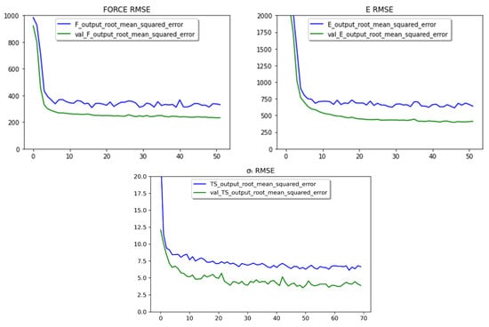 Using the optimal architecture to train the NN model yielded the results shown in Figure 12. These plots show that the model converges to a minimum, and there is no evidence of overfitting. Here, the blue line shows the change in the RMSE during the training step, while the green line tracks the validation procedure.
