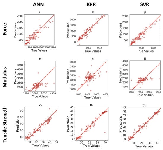 Comparing the other two ML approaches and RSM, it can be seen in Table 9 that the SVR algorithm has the highest R2 for F, E, and σt outputs. From here, it can be seen that increasing the nonlinearity of the model does not necessarily lead to better prediction accuracy. Compared with ANN, SVM has an advantage in predicting samples with limited data by using quadratic optimization and penalizing parameters to avoid falling into local minimums and overfitting [36]. Performance was relatively poor in terms of E prediction for all tested algorithms. This is visualized in Figure 13, where the true value of a response is plotted against the prediction of the model. A model that perfectly captures the behavior of the system is represented by a line of slope 1. Note that for all models, the corresponding graph of the predicted versus true value of E shows large deviations from the ideal behavior slope. The data for E showed the largest variability within replicates out of all of the measured outputs, which may explain why the algorithms have difficulty converging to a solution close to the “true” value.