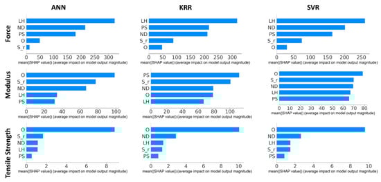 SHAP results from KRR and SVR are shown on the second and third columns separately in Figure 14. The weight of each input variable for F and σt prediction from KRR and SVR is slightly different from the conclusion driven by ANN, but the layer height always has the highest contribution to F prediction and the orientation has the most significant influence on the prediction on σt, which could lead to similar RMSE values for F and σt predictions. However, the weights show a significant difference in E predictions between KRR and the other two. Instead of considering orientation as the most important factor in modulus prediction, the weights from KRR have a more even distribution than ANN prediction, and printing speed is at the top of the rank, which could be the reason for the hardness of E prediction. Every input has a relatively even contribution to the output, which makes the algorithm hard to converge with such many flexibilities. Orientation was only the most important contributor to predictions of σt, which is theoretically supported since orientation has been shown through other studies to have a significant impact on the modulus of printed coupons [37]. All models place the factors that affect volumetric throughput () as the most important when dealing with predictions of extrusion force, which agrees with theoretical melting models based on transport phenomena [4,38,39].