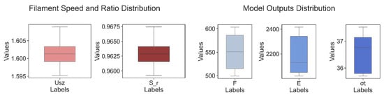 Following the same procedure as before, each print consisted of 4 coupons, and each print was repeated 2 times. The printing parameters and experimental data of 8 samples are shown in Table 11. To be able to observe the data distribution more clearly for each output category, the box and whisker plots were made separately for each category. It can be seen in Figure 15 that the variation of the speed ratio of various samples is relatively low, but the output values, especially F and E, have a certain degree of variation on each replicate. Consequently, all eight speed ratios from different samples are inputs in three models. The relative error between prediction and experimental values is calculated for the model’s performance evaluation.