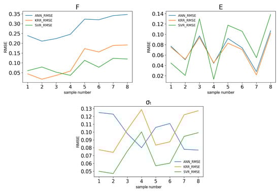 The relative errors of three outputs from three models are shown in Figure 16. For the printing F and σt predictions, SVR has relatively low relative errors, which are in the range of 5% to 10%. However, the E prediction by SVR has a larger range of relative error compared to the other two regressors. The samples #3, 5, 6, and 8 have high errors based on the trends of all three algorithms, which have a good match with the experimental results of the samples that have relatively low E, as shown in Table 9 above. As all input values of 8 samples are close to each other, the significant differences between outputs would contribute to prediction errors, especially in the scenario where the value range of the data is at a high level, which is between 2022.44 MPa and 2417.93 MPa. In this case, testing more samples for each condition could be a good way to eliminate the experimental bias in the future. Overall, the SVM has the best performance on the prediction of mechanical properties and printing force. This could be attributed to its punishment and margin-fitting regimes.