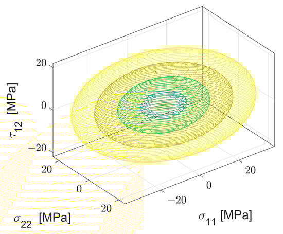 As the model is capable of predicting the σt in the 0° and 90° orientations, it lends itself well to generate a very conservative version of the Stress-Stress Interaction Criterion (SSIC). Assuming that the failure at shear is approximately the failure at tension at 90°, that the failure stresses in compression are equal to their corresponding failure in tension, and that all stress interactions are 0, one could generate a SSIC failure envelope for a part as soon as it is finished printing. As an example, the failure envelope shown in Figure 17 and Figure 18 was developed for printing conditions . This could prove particularly useful for the automotive or aerospace industries, as all attempts known to the author to predict failure in AM through failure criteria are locked to a fixed set of printing conditions.