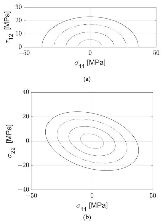 Predicted Failure envelope projections. (a) Predicted failure envelope projection in the σ11-τ12 plane. (b) Predicted failure envelope projection in the σ11-σ22 plane. (c) Predicted failure envelope projection in the σ22-τ22 plane.