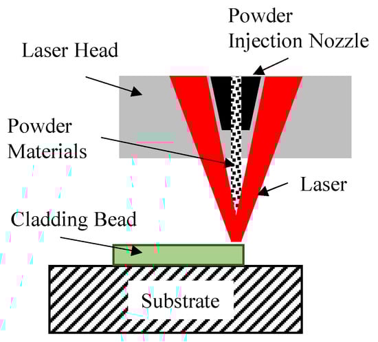 Among AM technologies, the laser metal deposition (LMD) method is an innovative process that implements a laser as a precise and controlled heat source to melt powder materials and generate a cladding layer with a distinct composition on the substrate [10,11,12,13,14,15]. This method minimizes the thermal impact on the substrate and facilitates the formation of a specific localized cladding layer. It can also enable the formation of a cladding layer with a specific composition tailored to the desired properties or functionalities [16]. Different types of powder materials can be fed into the laser beam, ranging from metals and alloys to ceramics or composite powders [17]. This flexibility enables the production of cladding layers with superior hardness, wear resistance, corrosion resistance, or even entirely new material combinations [18]. Nevertheless, one of the problems associated with this method is its tendency to frequently generate voids and cracks within the deposited spots, which, in turn, can undermine its structural integrity and strength [19,20]. Consequently, it has become imperative to conduct research and experiments aiming to develop and implement effective techniques to mitigate and reduce the occurrence of these undesirable voids and cracks. By doing so, it becomes possible to enhance the practical viability and reliability of this method for a wide range of real-world applications.
