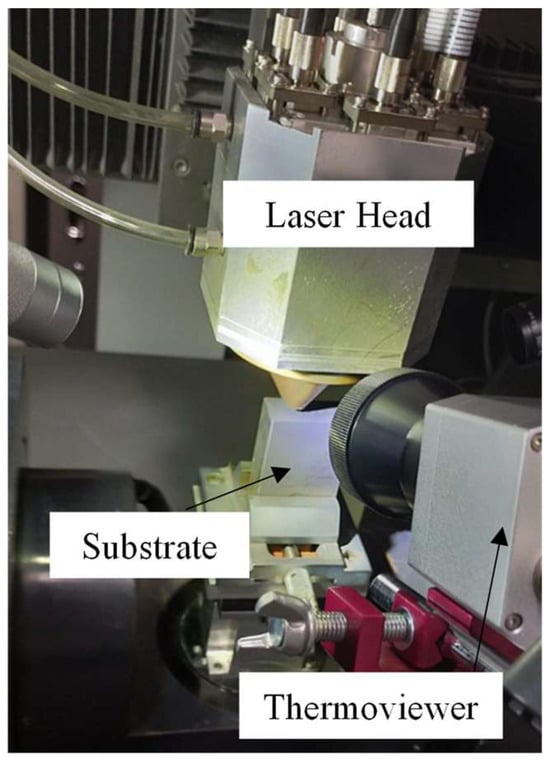 Temperature measurements were conducted using a thermoviewer (PI 640MO, Optris). The specification of the thermoviewer device is listed in Table 2. When utilizing the thermoviewer for temperature monitoring during the M-LMD process, it is essential to precisely determine the emissivity of the used materials. Therefore, the substrate is in a molten state in the laser-irradiated region, making it difficult to determine the emissivity. In order to overcome this problem and guarantee accurate temperature measurements, a blackbody coating material (JSC-3, Japansensor Inc., Tokyo, Japan) was carefully coated onto the surface of the substrates before performing the M-LMD process. The blackbody coating material exhibited distinct characteristics that provide it well-suited for this particular application. With a remarkable thermal stability reaching a temperature as high as 1500 °C, this coating material exhibits an exceptional capacity to endure the rigorous thermal conditions encountered throughout the LMD process. Moreover, it is worth noting that the blackbody coating material exhibits a well-established and consistent emissivity value of 0.94, thereby offering a dependable point of reference for accurate temperature examinations. Through the application of the blackbody coating material, the inherent uncertainties arising from the molten state of the substrate and the variations in emissivity within the surrounding areas are effectively alleviated. The implementation of this approach facilitates the acquisition of temperature measurements that exhibit enhanced precision and reliability throughout the M-LMD process. The implementation of the blackbody coating material guarantees the attainment of dependable temperature measurements, thereby enabling accurate control and observation of the M-LMD process.