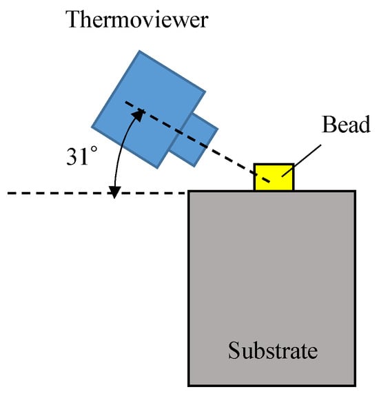 In Figure 3, the experimental setup for temperature monitoring using the thermoviewer is shown. It demonstrates that a powder injection nozzle is fixed above the bead forming region, facilitating powder injection and laser irradiation. As a result, direct temperature measurement from above is not feasible due to the obstructed view caused by the presence of the nozzle. Moreover, employing the thermoviewer to determine the location of laser irradiation after taking temperature measurements may introduce inaccuracies due to the specific angle employed during the measurement process. To tackle this challenge and ensure accurate temperature measurements, a leveling device was employed, as depicted in Figure 4. The purpose of this leveling device is to determine the camera angle used for the temperature measurements. By precisely measuring the camera angle, any potential errors arising from the specific angle during the measurement process can be accounted for and mitigated. For the described experiment, the camera angle was measured to be 31° using the leveling device. This measurement serves as a crucial calibration parameter that enables the accurate interpretation of the temperature data obtained from the thermoviewer.
