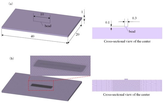 Figure 5 illustrates the models used for the simulation of the substrate and the bead. The substrate was set to 20 mm × 40 mm × 1 mm. Normally, the thickness dimension should match the actual substrate. However, no significant effect on the temperature of the substrate and the bead was observed when varying the thickness dimension. Therefore, for this study, the thickness was set to 1 mm. A mesh size of 0.43 mm × 0.43 mm × 0.1 mm was used for the substrate model. Additionally, for the area surrounding the bead region, considering a laser focal diameter of 0.3 mm, the mesh size was set to 0.05 mm × 0.05 mm × 0.1 mm. The material used for the substrate model was JIS SKH51. As depicted in Figure 5, the bead size was set to 10 mm × 0.3 mm × 0.1 mm. For the bead model, a mesh size of 0.05 mm × 0.05 mm × 0.05 mm was created. The material used for the bead was the WC-12mass%Co cemented carbide. The bead was placed in the center of the substrate. The physical properties of the JIS SKH51 and the WC-12mass%Co cemented carbide are presented in Table 3 [24,25,26,27]. The physical properties of the WC-12mass%Co cemented carbide were calculated from the physical properties of WC and Co obtained from [28].