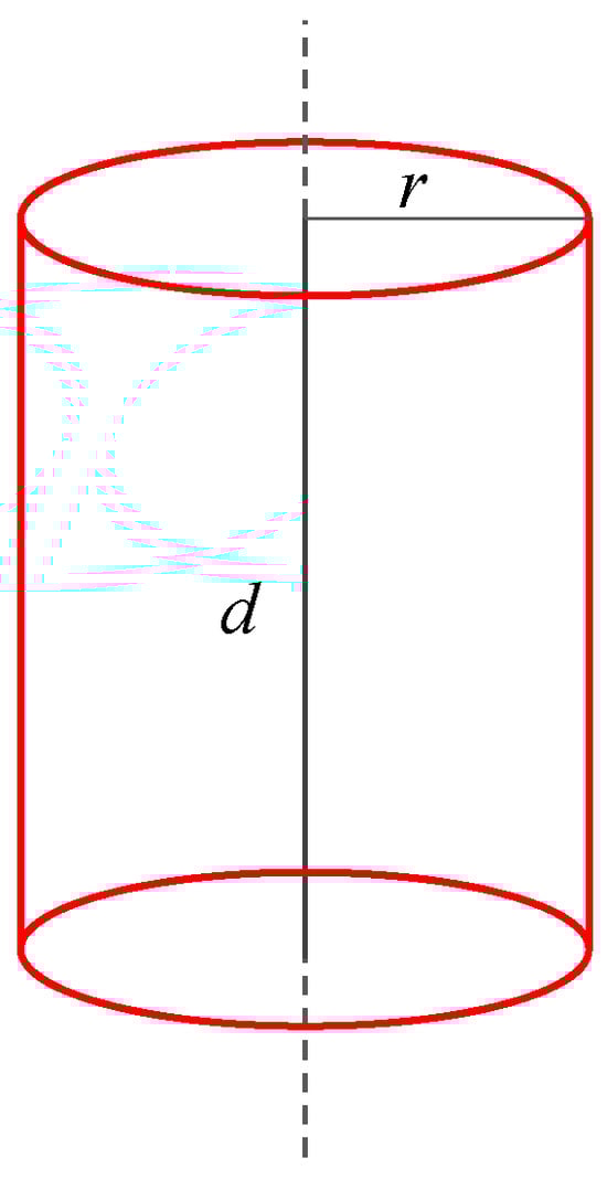 For temperature predictions through simulations, two points were considered: a point in the substrate away from the laser-irradiated area and another point at the center of the laser-irradiated area. The simulation parameters are presented in Table 4. The scanning speed was kept constant at 20 mm/s, and the laser power was varied in five conditions from 80 W to 160 W in increments of 20 W. The radius and depth of the heat source are illustrated in Figure 6. The cylindrical heat source radius, r (mm), was set at 0.15 mm, considering the laser-focusing spot diameter. The heat source depth, d (mm), was set at 0.1 mm, because a laser absorption phenomenon usually occurred on the surface of the substrate. The heat source position was set between the surface of the substrate and that of the bead in the simulation. The laser absorption coefficients of the powder (WC-12mass%Co) and the substrate (JIS SKH51), determined using a laser wavelength of 1 μm, were 0.82 [30] and 0.35 [31], respectively. Most of the laser passes through the powder and reaches the substrate; therefore, the energy efficiency of heat source was set at 0.35.