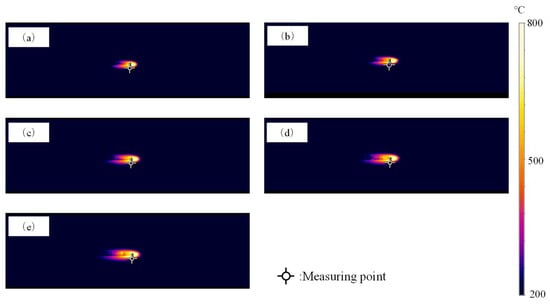 In order to conduct a comprehensive thermal analysis, temperature measurements were acquired at a specific point situated at a distance from the bead. The temperature measurements were graphically represented in order to observe and analyze the temporal variations in temperature. Despite the presence of a blackbody coating material on the surface of the substrate in the bead area, the cladding process was executed on the aforementioned blackbody coating material, leading to the emergence of diverse emissivity. Additionally, it is important to consider the pixel size and field of view of the thermoviewer utilized in this study. Each pixel of the thermoviewer corresponds to an area of 0.03125 mm × 0.03125 mm. With this information, the location for measuring the temperature can be determined, taking into account the camera angle as well. Therefore, this study chose 0.2 mm away from the bead center as the optimal location for temperature evaluation, where the integrity of the blackbody coating material is not affected by the M-LMD process (in Figure 2).
