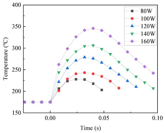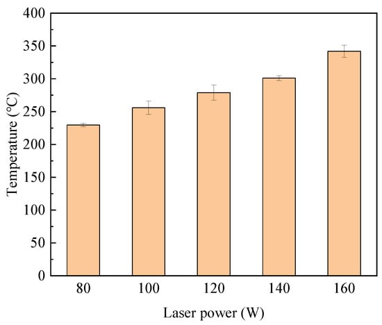 Figure 7 presents thermal profiles during the experiments. The temperature changes over time for each laser condition are shown in Figure 8. It can be observed that as the laser power increases, the maximal temperature of the substrate also increases. Additionally, Figure 9 shows a bar graph of the maximal temperature for each laser condition. It can be observed that the temperature reached 229 °C for a laser power of 80 W and 341 °C for a laser power of 160 W. These findings can be explained using the equation for the input energy per unit area, E (J/mm2), as follows: