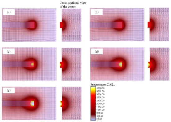 Temperature distribution of the beads, substrate surface, and cross-section at the center of the substrate corresponding to each LMD condition obtained by the simulation with the laser absorption coefficient of 0.35 after 0.25 s from the start of forming the bead. (a) 80 W, (b) 100 W, (c) 120 W, (d) 140 W, and (e) 160 W.