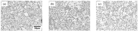 Figure 11 shows the simulated maximum temperatures at a position 0.2 mm from the center of the bead area, which is the same position as in the thermoviewer experiment. The simulation was performed using a laser absorption coefficient of 0.35, which was the absorption coefficient of the substrate. In addition, temperature simulation results obtained using the laser absorption coefficient of 0.1 and 0.2 are shown. At a laser absorption coefficient of 0.35, the simulated maximum temperatures did not match the experimental results obtained by the thermoviewer. At the laser absorption coefficient of 0.1, the temperature-incremental trend was close to the experimental results obtained via the thermoviewer. Figure 12 shows the maximal temperatures at the center of the beads and a height of 0.05 mm from the substrate surface for each laser irradiation condition. When a laser absorption coefficient of 0.1 was applied, the maximal temperature was 1465 °C even at 160 W. This means that the maximal temperature of the bead formed by 160 W was barely able to reach the melting point of the substrate. Thus, it can be said that applying the laser absorption coefficient of 0.1 is not appropriate for forming beads. Considering the situation in which the bead was formed at 80 W, it is reasonable that the absorption coefficient should be 0.2 or higher. However, these values of absorption coefficient do not match the temperature measurement results with the thermoviewer, as shown in Figure 9 and Figure 11. Gas blowing, which was used when supplying the powder during the LMD process, was not taken into account in the simulation; thus, it can be considered that the simulation condition without gas blowing caused the higher temperature at the surface of the substrate. Figure 13a–c show SEM images of the cross-sections of the beads. At a laser power of 80 W, angular grains of the WC phase and dendritic structures composed of M6C phase [15] can be seen as shown in Figure 13a. With the increase in laser power, the volume fraction of the WC grains decreased. Instead, it can be confirmed that the grain growth of the dendritic structures of M6C phase progressed as the laser output increased. Considering the formed microstructures and the pseudo-equilibrium phase diagram [29], it was suggested that simulation using a laser absorption coefficient between 0.1 and 0.2 may indicate more accurate temperatures of the beads in terms of microstructural point of view. The M6C phase is well known for affecting the fracture toughness [32]. As the laser power increased, the volume fraction and size of M6C phase increased. These microstructural changes can be considered as a contributing factor for the increase in the number of cracks. In our previous research, we investigated the number of cracks using an AE sensor and obtained the results shown in Figure 14 [18]. These results show that the number of cracks indeed increased as the laser power increased, resulting in increasing the risk of crack initiation. These results correspond well with the microstructural observations of the formed beads.