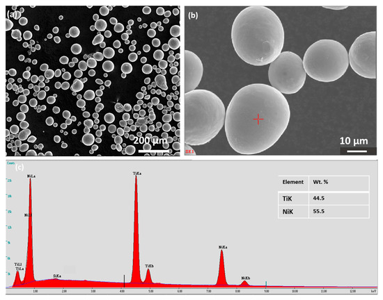 (a,b) Feedstock of NiTi powder; (b) Enlarged view of the NiTi particles; (c) EDX analysis of the red cross in (b) shows the inset element of Ni, Ti in Wt. %. With permission © 2022 by the authors. Licensee MDPI, Basel, Switzerland. This article is an open-access article distributed under the terms and conditions of the Creative Commons Attribution (CC BY) license (https://www.mdpi.com/1996-1944/15/23/8598 (accessed on 2 December 2022).) [14].