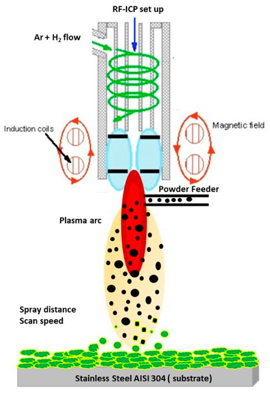 Impact of particles through a plasma arc for the deposition of coating layers on the substrate. With permission © 2022 by the authors. Licensee MDPI, Basel, Switzerland. This article is an open-access article distributed under the terms and conditions of the Creative Commons Attribution (CC BY) license (https://www.mdpi.com/1996-1944/15/23/8598 (accessed on 2 December 2022).) [14]. The spraying distance of 60 mm is chosen to cover the top surface area of the substrate with a scan speed of 1–2 mm/s.
