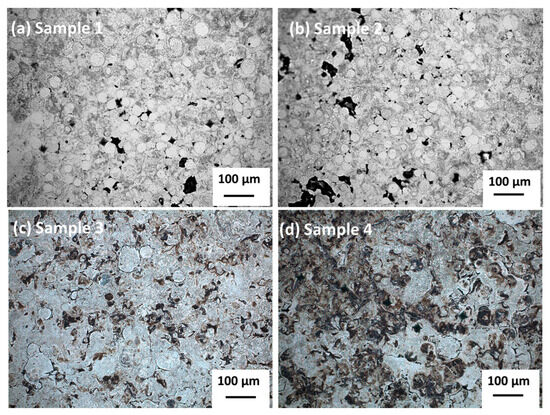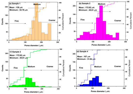 The mean diameter of pores within the range of 0–150 µm is well found in sample 4 (Figure 9). The pores are elongated in nature, as confirmed by the X- and Y-axis diameter measurements. Sample 4 confirms a smaller number of pores (213) with minimum sizes along the cross-section. There are interconnected pores along the cross-section lines that form cracks that may result from the mismatch of thermal expansion between the substrate and coating layers. The summary of pores as a function of pore size with counts and cumulative percent is presented in Figure 10a–d. It has been observed that samples 1 and 2 have more pores compared to samples 3 and 4. However, the larger pore distribution is more prominent in sample 2. Sample 3 shows various ranges of pores. Sample 4 has a limited range of pore distribution. The selected area with a zoomed-in view of elongated and spherical pores with interconnections making cracks is well visible in Figure 11a–d. The colors are chosen to highlight the visibility of pores.