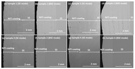 (a–h) Cross-section of plasma-sprayed coatings 1–4 in SE and BSE mode shows the substrate stainless steel (SS) and NiTi coating layers (6 layers).