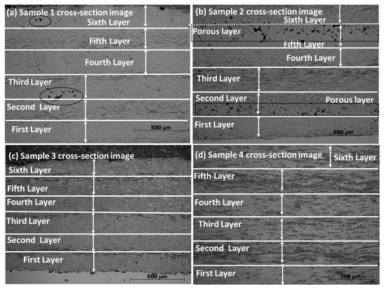 The quantity and morphology of the porosity are crucial to the physical and mechanical properties of the coatings [24,25]. In the plasma-spraying process, the NiTi particles are molten and accelerated for their impact on the substrate, where rapid solidification and deposition build-up occur. Generally, the porosity in plasma-sprayed coating has been categorized by three sources of origin. Interlamellar pores and globular or irregular pores are caused by imperfect contact, and partially molten particles as well as intersplat cracks are due to stress relaxation. However, these porosities in plasma spray coating can be minimized by optimizing the spray parameters, for instance, the plasma input power, feed rate, number of spray passes, stand-off distance, preheating, etc. In multilayered coating, the layers are formed of more than one identical layer on the substrate. The function of multilayer coating is to reduce the chance of defects such as microcracks or pores propagating through the layers [26,27]. Multilayered coatings improve the interface layers, which could provide the transition from the substrate to the adjoining layers with better adhesion, with a smoother transition with additional layers [28,29,30].