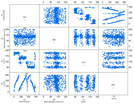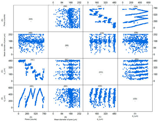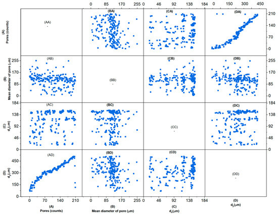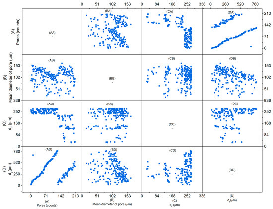Scatter of matrix of pores in sample 2 (A: number of pores; B: mean diameter; C and D: diameter of X- and Y-axes).
