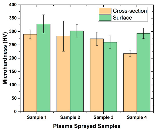 Microhardness of surface and cross-section of the plasma-sprayed samples 1–4.