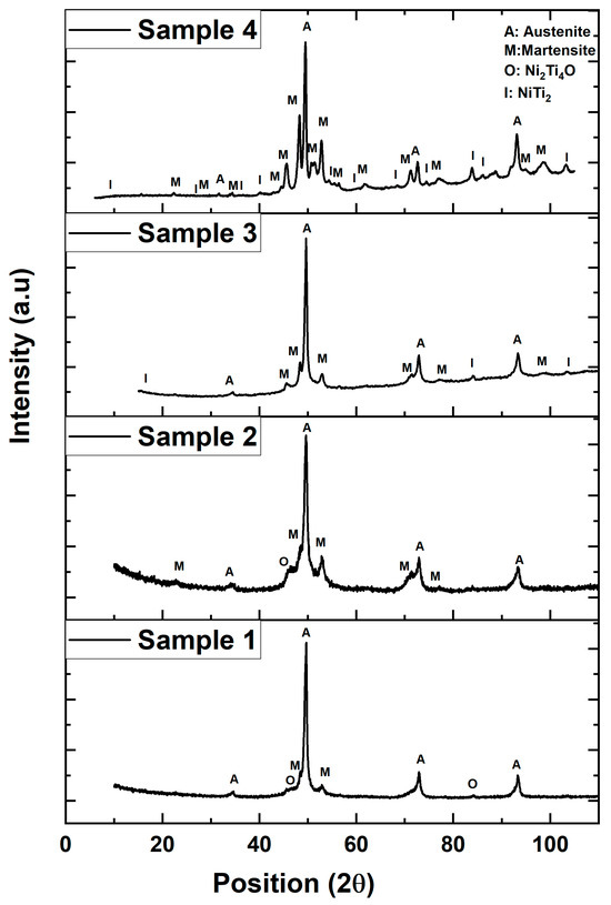Phase identification for samples 1–4 by XRD pattern shows the austenite (B2), martensite (B19′), oxide, and intermetallic compounds.