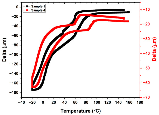 Thermo-mechanical behavior of the plasma-sprayed samples is presented in Figure 14. Samples 1 and 4 are selected from the group as representative of coatings with and without porosity. The hysteresis behavior of both samples is observed as a function of thermal cycles from cooling to heating. However, sample 1 shows a non-uniform area of hysteresis with a narrowly distributed zone compared to sample 4.