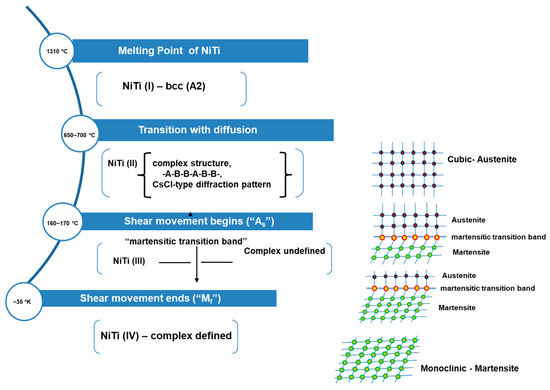 Schematic diagram of the structural variations of stoichiometric NiTi (nominal 5 Nitinol) as a function of temperature. Redrawn from [35].