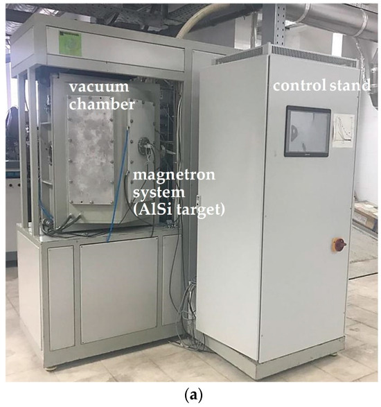 Table 2 provides information on the technological conditions for the TiZrN and CrAlSiN coatings’ deposition on the ceramic samples using magnetron sputtering on the unit shown in Figure 5.