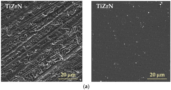 In addition, the experiments confirmed the significant influence of the state of the surface layer of ceramic samples on the quality of subsequently deposited coatings (in the case of the two compositions under study, namely TiZrN and CrAlSiN/DLC). As is seen in the SEM images (Figure 12), the increased density of defects in the surface layer of ceramic samples formed during diamond grinding indicates that its microstructure is characterized by a high degree of heterogeneity and porosity. It can be assumed that this is a consequence of the misorientation of the grains of the deposited film and the deterioration of growth conditions of the coating, which was observed by the authors of [73,74,75] that deposited various coatings on substrates with an increased level of microroughness.