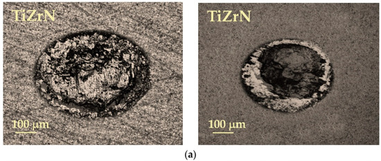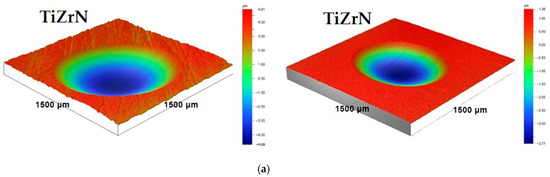When choosing coating options deposited on ceramic samples, we proceeded from the results of previously performed experimental studies on the characteristics of various nitride and DLC coatings performed by the authors of this work [62,63,64]. Two coating options were selected, such as TiZrN and CrAlSiN/DLC compositions, which demonstrated good tribological properties in contact with materials of various counter bodies. The deposition of a CrAlSiN coating before a DLC coating was caused by the need to reduce internal stresses and improve its adhesion to the ceramic substrate [65,66,67].