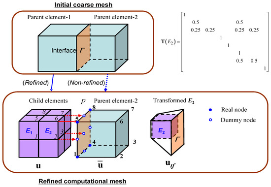 where u denotes the nodal variable vector of the child element (with both real and dummy nodes) and utf denotes that of the transformed child element (with only real nodes). The element is transformed by mapping the dummy node to the corresponding real node in the same nodal sequence of interface . T represents the transformation matrix between u and utf. It can be easily formed by identifying the type (real or dummy) and position of nodes, as shown in Figure 2. For example, the transformation matrix of the child element E2 is demonstrated herein. For the real nodes, the vector in the T matrix takes the corresponding ith column of a unit matrix, while for the dummy nodes, the linear constraint equation in Equation (1) can be directly observed.