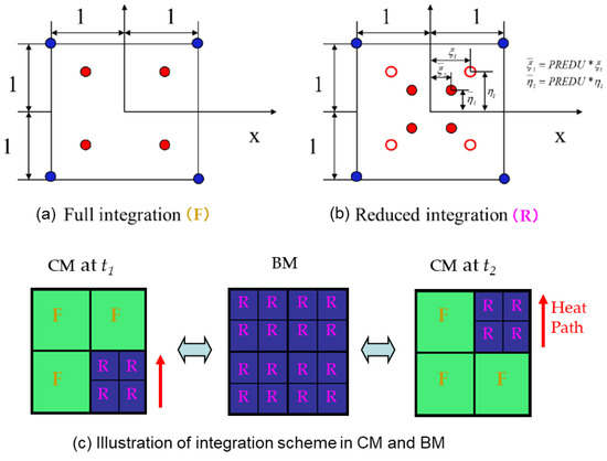 To facilitate the stress and strain update using computational mesh (CM) throughout the simulation, it is necessary to keep the consistency of the stiffness matrix between the assembled load vector from BM and those from the original CM. The concept of reduced integration in Joining and Welding Research Institute ANalysis (JWRIAN) code is schematically shown in Figure 3a. Different from one-point integration, the second-order integration points are still used, but they are moved toward the position of the first-order integration point (or element center). This integration scheme can greatly reduce the stiffness of the element and prevent the hourglass mode. As shown in Figure 3b, the parameter PREDU is called the reducing factor. In the case of thermal elastic-plastic analysis, reduced integration with PREDU taking a value around 0.1–0.2 can ensure the solution’s accuracy. For the N-AMR method, reduced integration for all elements indicates a full integration when the stiffness and load vector are assembled from BM to CM. It can be anticipated that the inconsistency between the CM stiffness (direct reduced integration) and the one assembled from the BM (equivalent to full integration) will hinder a continuous solution using computational mesh due to convergence problems. When the stiffness and load of child elements in BM are calculated via reduced integration and then summed up to CM, it is equivalent to a second-order full integration on the parent element in CM, as shown in Figure 3c. Therefore, the hybrid integration scheme has the potential to fulfill the consistency condition and stabilize the analysis.