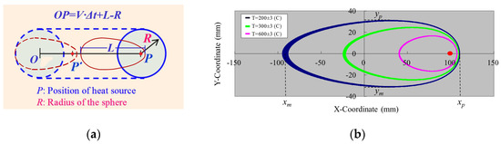 With a predefined temperature value of T0, the points that have a value close to T0 can be sampled from Equation (10) in the Euclidian space. As an illustration in Figure 4b, the points are searched for three temperature contours with a tolerance of ±3 °C on the x-y plane. It can be seen that the region near the heat source has a steeper temperature gradient, while the rear part has smoother distribution as indicated by the bandwidth of temperature. By measuring the width and length of the preferred temperature profile, the initial length L0 and initial radius R0 are obtained as (xp − xm) and (yp − ym)/2, respectively. Then, the initial values can be multiplied with a scaling factor to meet the requirement of non-uniform stress distribution at the front part of the heat source, as shown in Equation (11). The scaling also takes into account the plasticity effect at the rear part, which is still under thermal load.