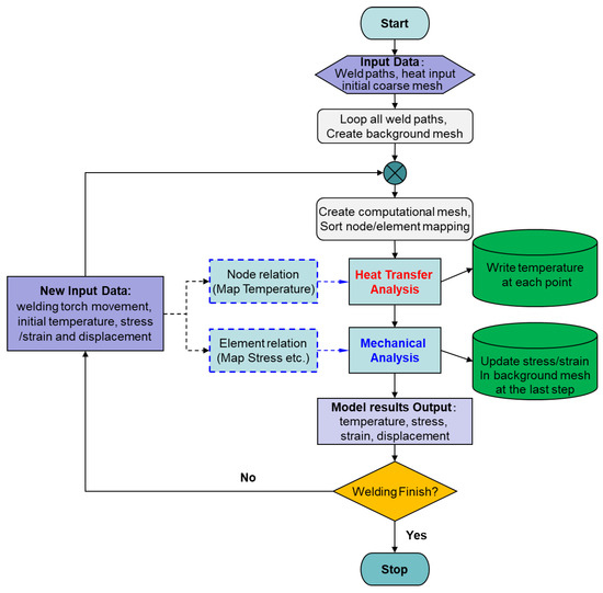 The computation flow of the developed adaptive mesh refinement method is schematically shown in Figure 5. Initially, a coarse mesh is prepared for refinement; the maximum mesh size takes a reference to the studies in the literature [28,29]. The parameters for the welding condition and solution control are defined as the input data. The thermal analysis and mechanical analysis are sequentially coupled, and the analyses for each time increment are organized in a loop.