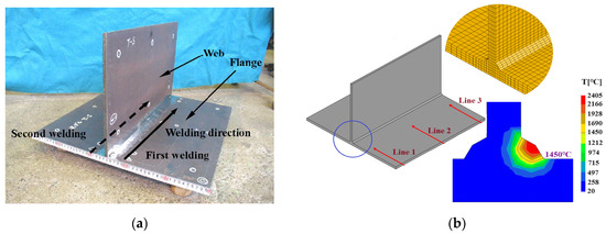 The simulation approach N-AMR was developed based on an in-house code JWRIAN developed by the Joining and Welding Research Institute at Osaka University. To confirm the accuracy of the thermal elastic–plastic analysis, the JWRIAN code, representing a typical conventional FEM, was employed to analyze welding deformation in a fillet joint. The experimental model designed by Deng et al. [30] is shown in Figure 6a. The flange plate has dimensions of 500 mm × 500 mm × 12 mm, and the web plate is 500 mm × 300 mm × 9 mm. The welding was performed using a single-sided welding process. Two sides were sequentially welded using welding current 270 A, voltage 29 V, and a speed of 400 mm/min. Vertical displacements were measured on three lines, as shown in Figure 6b. The distances from the welding start position were 20 mm, 250 mm, and 480 mm, respectively. In addition, the transverse displacements at four locations, which are 10 mm away from the weld ends and 50 mm away from the web plate, were measured on both the upper surface and the lower surface. The welding was carried out via tack welding first at the beginning, middle, and end of the flange plate, and then regular welding was performed along the weld line. The details, such as experiment conditions and material properties, can be referred to in the original article.