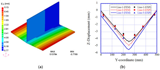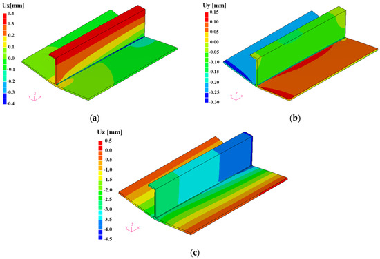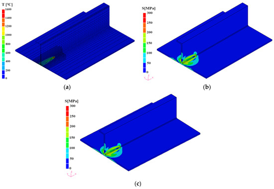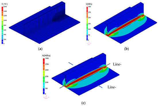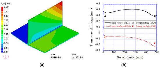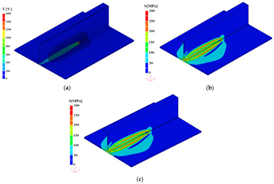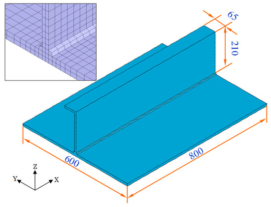 In the experimental work cited for model validation, the temperature was not measured in the welding process, and there was no cross-section cut to compare with the numerical results as well. In this study, the bead shape predicted by C-FEM is taken as a reference to validate the modeling accuracy by comparing it with the measured fillet with a size of 6 mm, as shown in Figure 6b. The material deposition process was currently not considered in the thermal and stress analysis; the impact from the metal droplet was considered to have a limited effect on the welding distortion and residual stress because the yield strength and stiffness over melting temperature is quite low compared to the state at room temperature. In this research, we align the welding direction to be the X-direction while it is the Y-axis in the publication by Deng et al. [30], but this will not affect the simulation accuracy and comparison with the experiment.